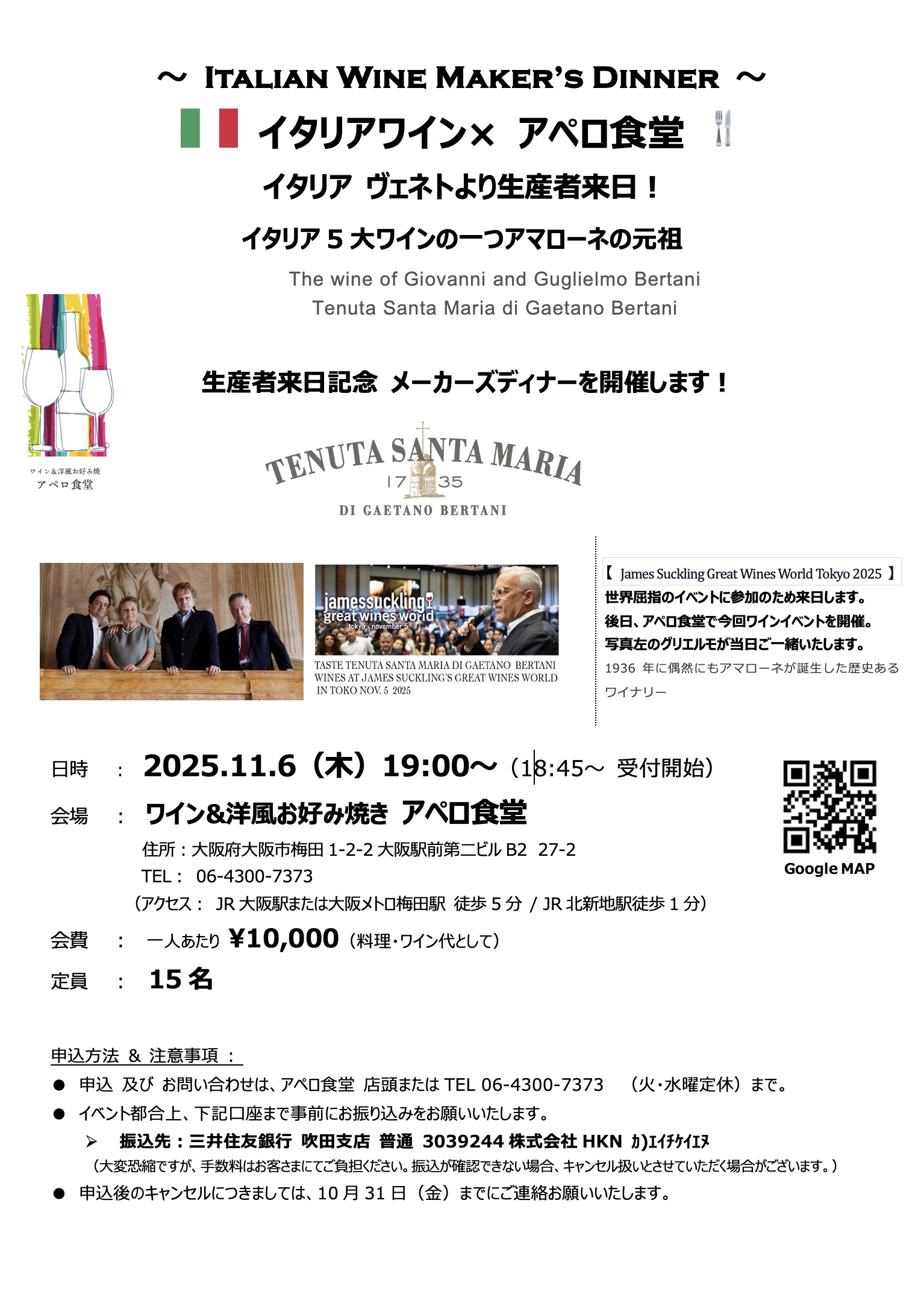 アマローネ生産者来日 メーカーズディナー開催します。 2025 10/12 お知らせ&ニュース 2025年10月12日 お知らせ&ニュース この記事が気に入ったら いいねしてね! 良ければシェアしてください! URLをコピーしました! シェリーウィーク参加します。 世界同時開催します。 この記事を書いた人 アペロ食堂 大阪・北新地のワイン&洋風お好み焼。 【洋風お好み焼】にワインを合わせる新感覚のお店。 大阪駅前第2ビル内、地下2階で交通のアクセス抜群。仕事帰りに気軽にぷらっとお立ち寄りください。 関連記事 シェリーウィーク参加します。 世界同時開催します。 2025年10月12日 阪神リーグ優勝 トラのビールです 2025年9月6日 社長お薦めワイン 9月Vol 1 2025年8月27日 第9回 「アペロ食堂ワイン会」を開催します。 2025年7月27日 選ぶワインに迷ったら / 7月上旬 2025年7月5日 6月の社長お薦めグラスワイン 2025年6月1日 お一人様用メニューが出来ました。 2025年4月4日 4月より新メニュー始まります。 2025年4月3日