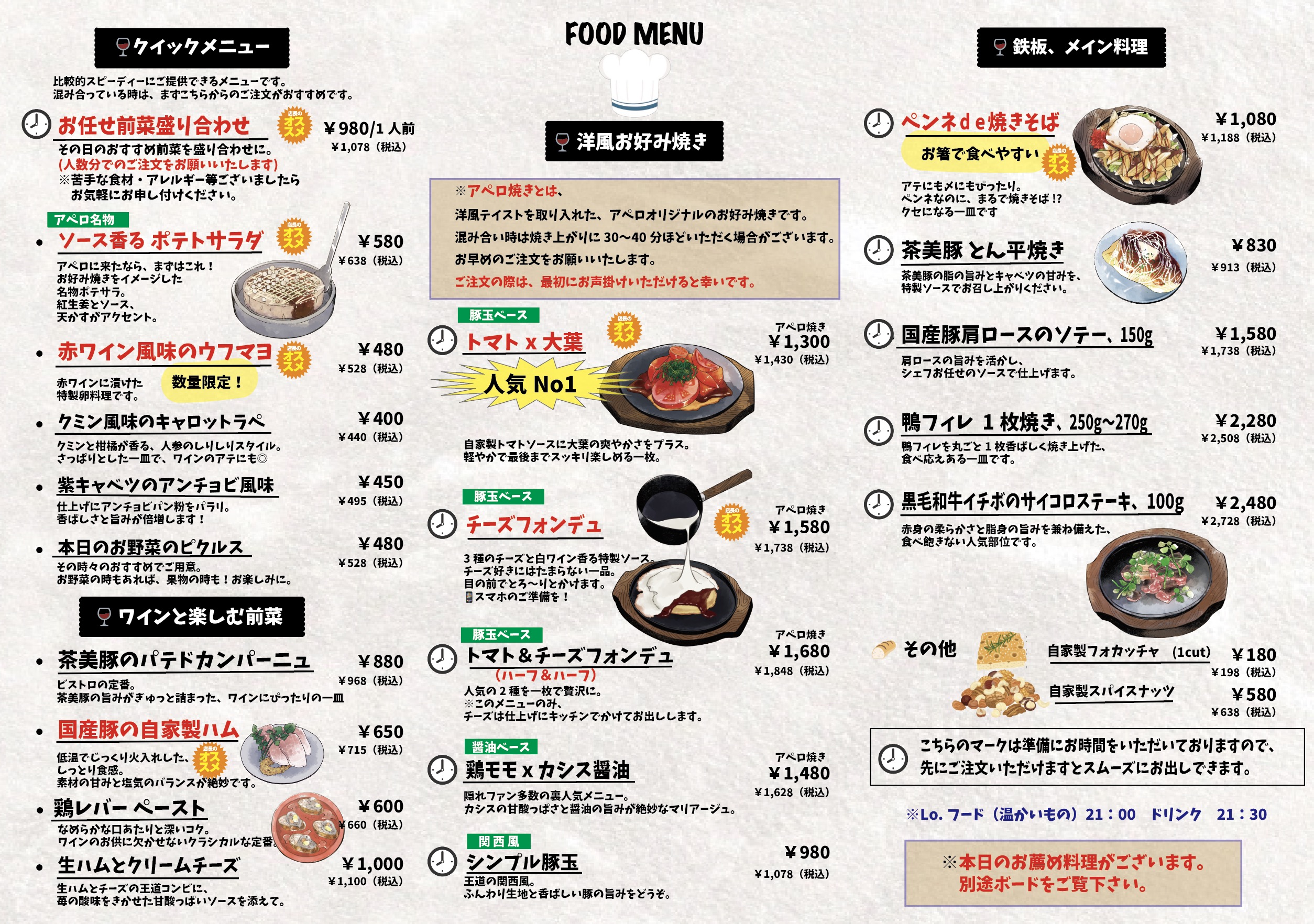 メニュを一部新しくしました。 また当日の野菜メニューも店頭にボードメニューとして表示いたしております。 2026 2/21 お知らせ&ニュース 2026年2月21日 お知らせ&ニュース この記事が気に入ったら いいねしてね! 良ければシェアしてください! URLをコピーしました! 21-Suggerst のワインに赤ワインを新しくしました。 この記事を書いた人 アペロ食堂 大阪・北新地のワイン&洋風お好み焼。 【洋風お好み焼】にワインを合わせる新感覚のお店。 大阪駅前第2ビル内、地下2階で交通のアクセス抜群。仕事帰りに気軽にぷらっとお立ち寄りください。 関連記事 2026年2月21日 21-Suggerst のワインに赤ワインを新しくしました。 2026年1月29日 新しいsuggestionの白ワイン登場 2026年1月25日 お薦めワイン 2026年1月7日 新年もどうぞよろしくお願いいたします。 2025年12月29日 年末営業は12月30日まで 予約結構入っております。 2025年12月27日 12月11日〜25日まで2周年感謝 グラスシャンパーニュ特価します。プティ贅沢をどうぞ。 2025年12月8日 ボジョレー・ヴィラージュヌーヴォ2025お祭り価格で販売 グラス500円/税抜 11月20日から 2025年11月15日